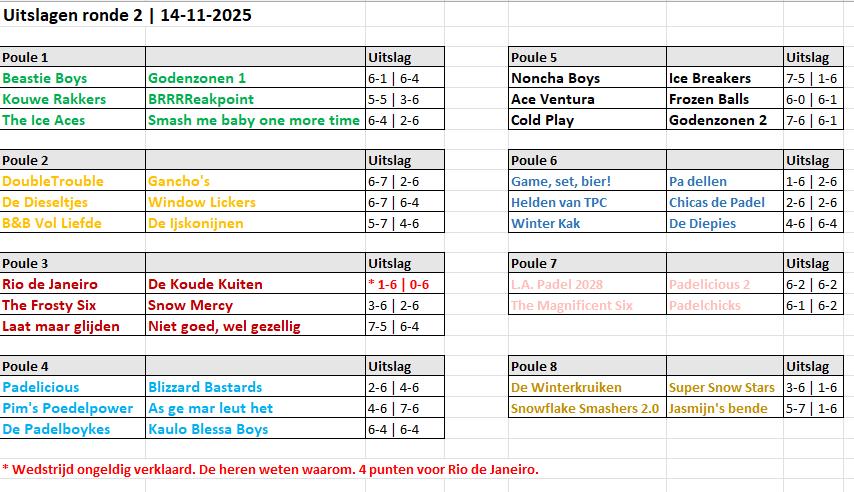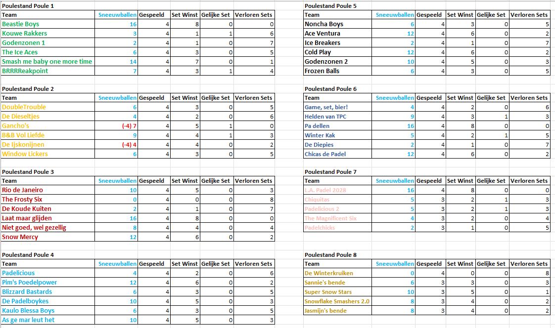 - Punten worden verdeeld op basis van 'sneeuwballen' ❄️: 2 voor een setwinst, 1 voor gelijkspel en 0 voor een verlies.